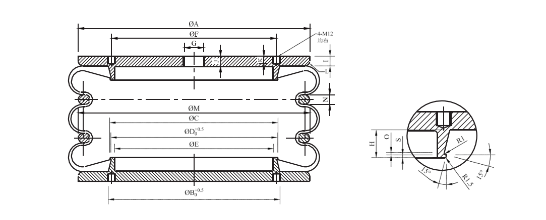 自封式,是因其無需外力自行密封而得名。如圖,用纖維層做補強處理的橡膠曲囊①在使用時,將防止膨脹的鋼制(鍍鋅)腰環②嵌在其中。③蓋板的端部鋼絲圈借助空氣內壓的作用,使橡膠口部發生變形與上下蓋板(鍍鋅)④密切接觸,從而可防止空氣泄漏。上下蓋板④通過機械加工成型。⑤是用于安裝進氣管路的管螺紋進氣孔,⑥則是安裝用的標準螺紋孔。